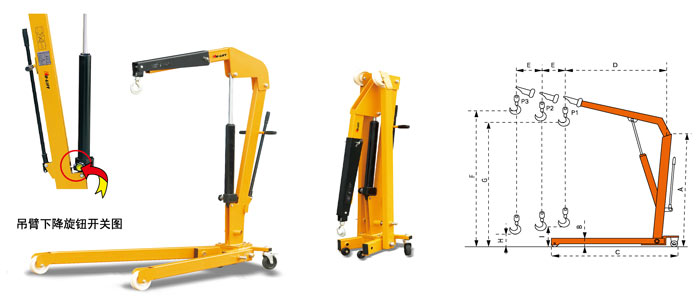 ● 重載設(shè)計(jì),高品質(zhì)的快起升油缸,省時(shí)省力 ● 根據(jù)需要.吊臂可三個(gè)工位調(diào)節(jié) ● 鍛造重載可旋轉(zhuǎn)吊鉤 ● 出廠前125%過(guò)載測(cè)試,保證安全使用 ● 符合歐洲CE安全標(biāo)準(zhǔn)