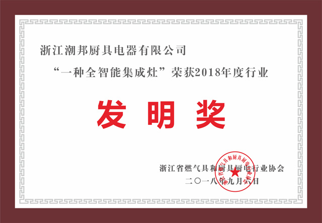 潮邦集成灶榮獲浙江省燃氣具和廚具廚電行業協會頒發的2018年度行業“發明獎”