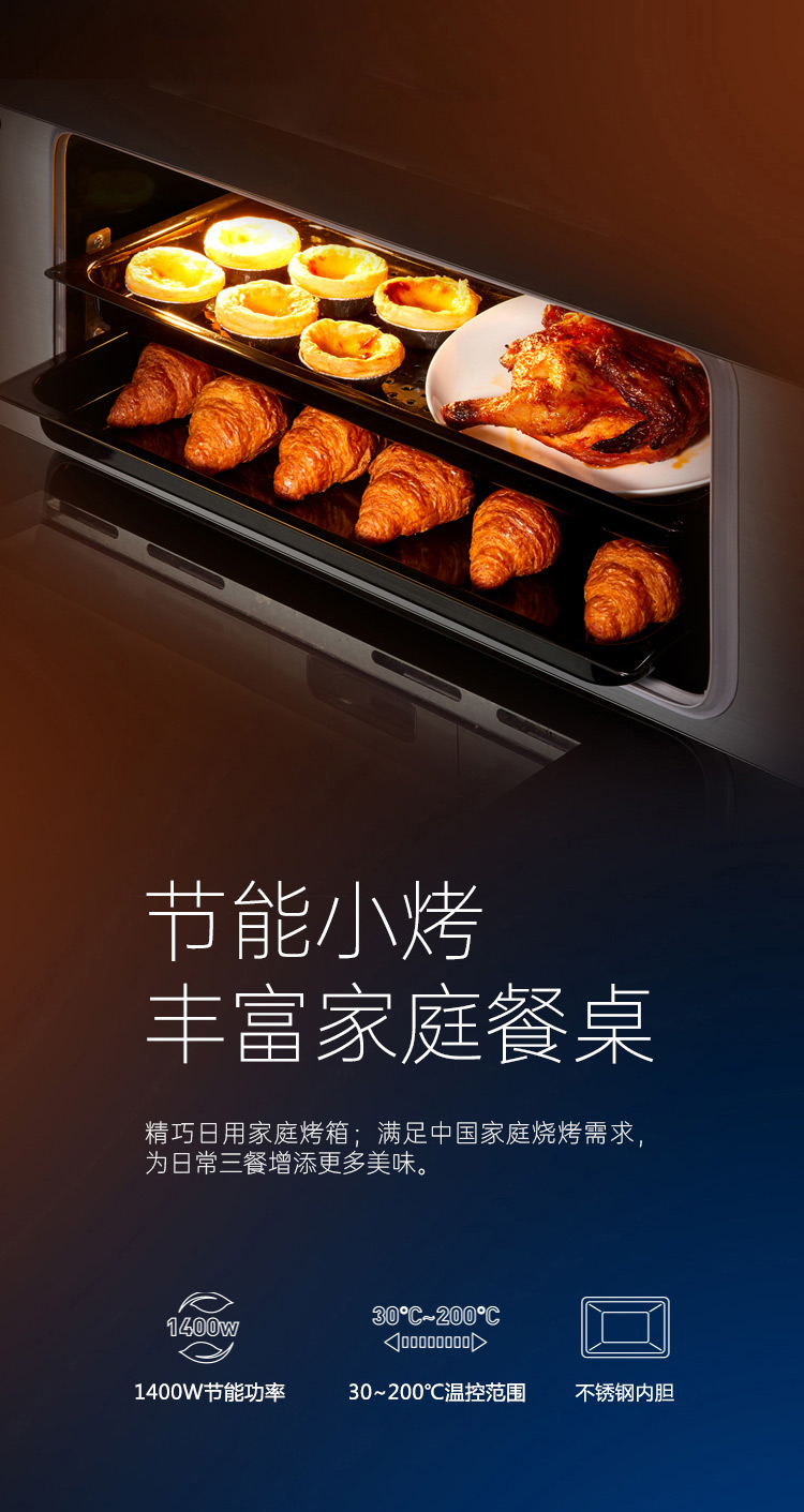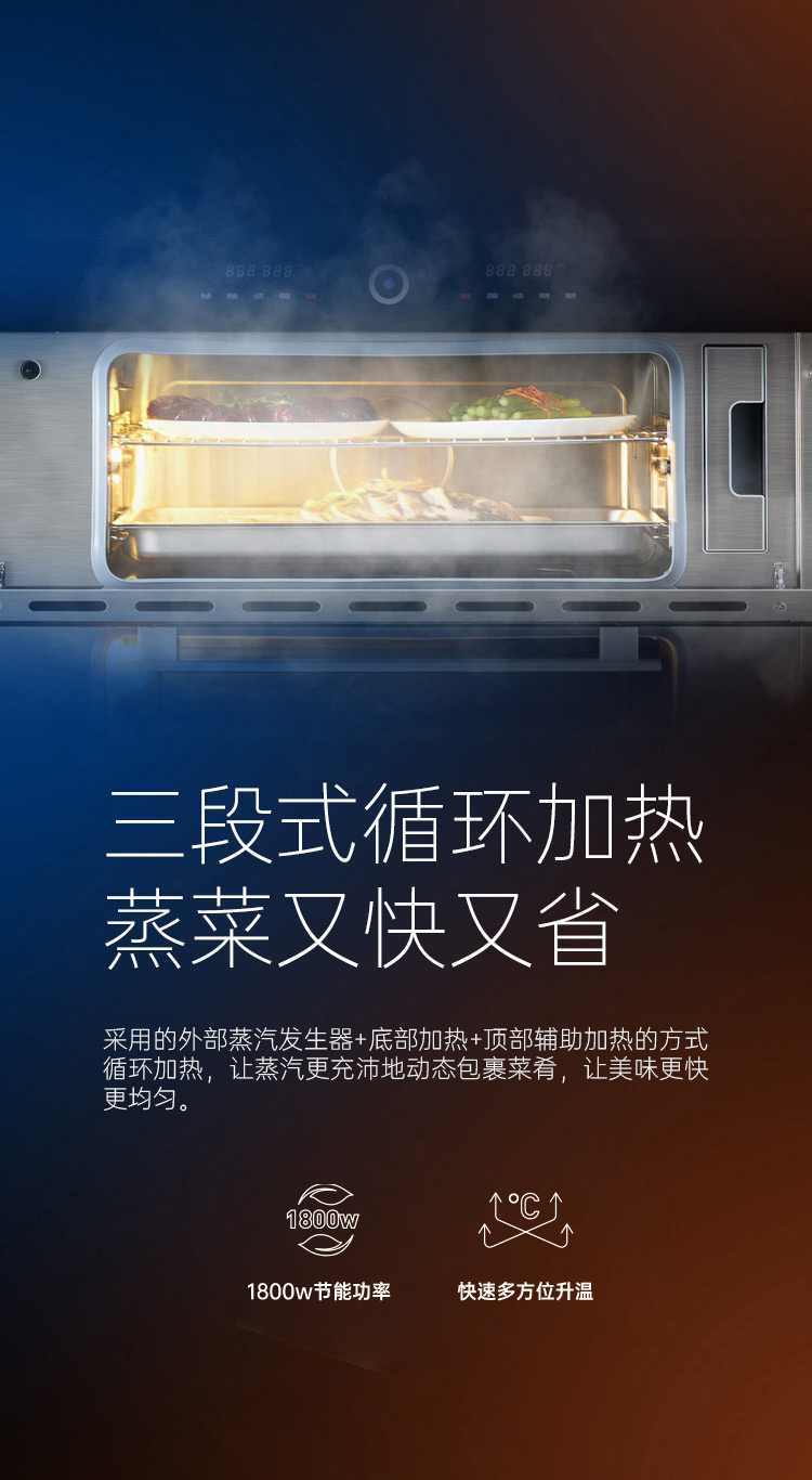 上蒸箱、下烤箱,實(shí)現(xiàn)邊蒸邊烤。更高效,更節(jié)能。